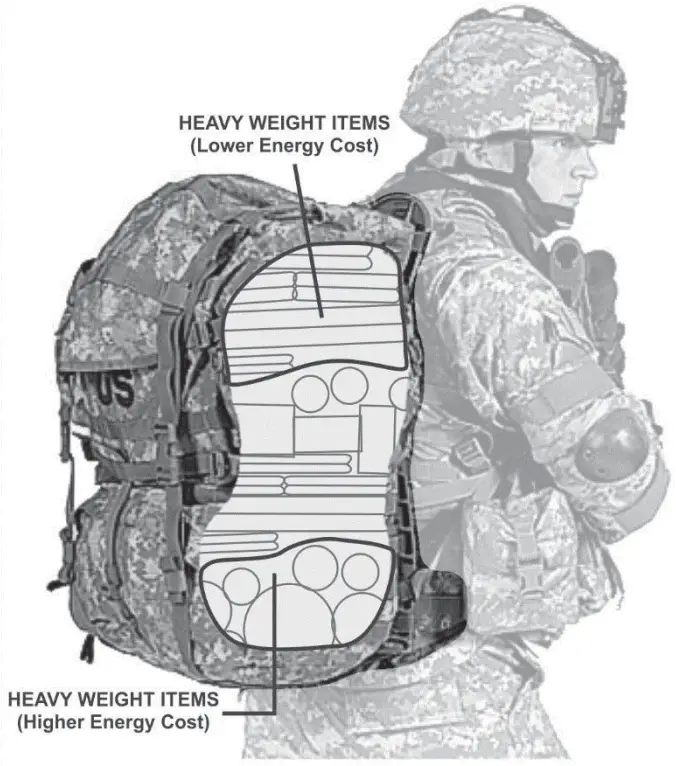 According to the US Army, packing heavier items higher up in the rucksack and closer to your body reduces energy consumption by 25% as opposed to carrying heavier items lower in the rucksack and away from your body.